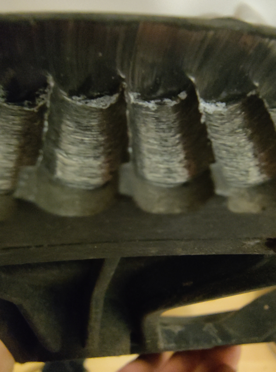 Gleich mit gewechselt habe ich die fast an die Verschleißgrenze abgefahrenen Bremssteine hinten. Der Zahnriemen litt an Paradentose und wurde auch erneuert. Und die im letzten Winter genutzte hintere Riemenscheibe sah auch so fertig aus, die ging gar nicht mehr und ist jetzt gegen eine kurzzeitig benutzte gewechselt. Es hatten sich richtig spitze Haufischzähne ausgebildet, von den vorherigen Rundungen war nix mehr zu sehen. Das riemenseitige Lager auf dem Winterrad war vom letzten Winter hinüber, Wasser war eingedrungen (Rost..) und eine Kugel hatte sich aus dem Lager komplett verabschiedet. Aber ich hatte beim letzten Mal ja gleich mehrere Lager und Wellendichtringe gekauft, und gleich mit dem benutzten Werkzeug in eine Tüte gepackt, so das es wirklich nur eine Arbeit von 5 Minuten war, das zu wechseln, das Rad war ja sowieso grade ausgebaut.