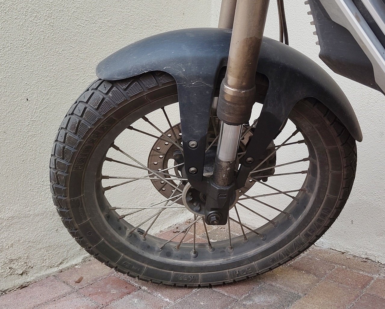 Und nein, der Süff auf Tauchrohr / Standrohr / Kotflügel ist keine Feuchtigkeit. Das ist Öl. Auch auf der Felge sind die Tropfen zu sehen. Möglicherweise hat die Gabel auch einen weg gekriegt, als mir das Fahrzeug umgekippt ist (allerdings war das nach dem TÜV). Der Lenker ist auch leicht schief seit dem Umfaller. Ich weiß noch nicht, ob ich erst mal einfach zwei andere Gabelholme nehme (hab ich auf Lager...) und den Wechsel der Dichtringe raus schiebe bis es zeitlich mal etwas entspannter wird.