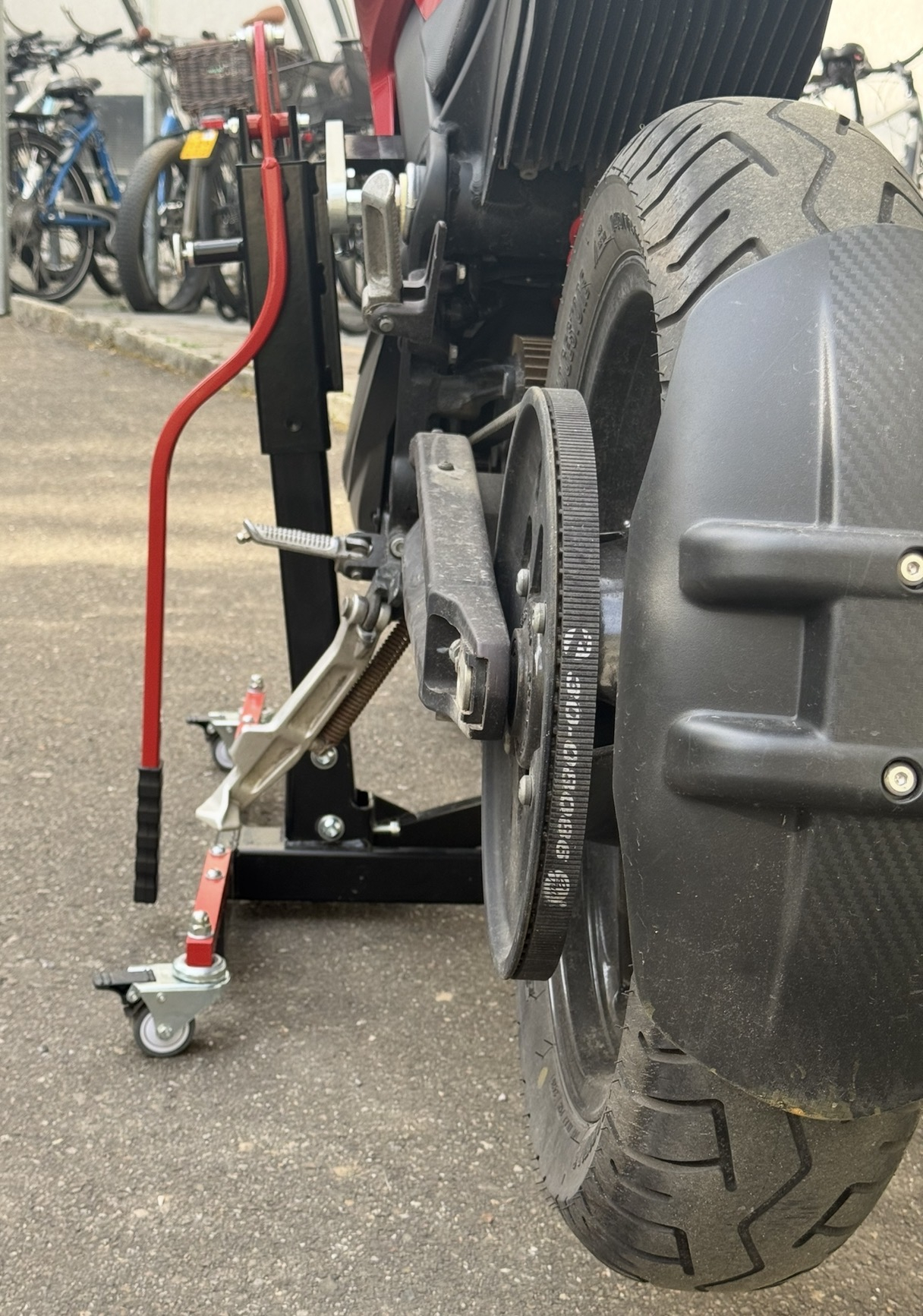 Was ich mich ferner gefragt habe: warum hast du den Adapter nicht weiter unten an der Hebemechanik angeschraubt? Sodass das Bike am Ende höher kommt? Der Hub an sich ist ja leider recht übersichtlich, wobei es natürlich schön ist, dass beide Räder sofort in der Luft sind und man eben NICHT am Bauch anhebt, was man offiziell bei der Zero auch gar nicht darf (und was nicht praktikabel ist, wenn man z.B. einen kaputten Onboardlader rückstandsfrei ausbauen will, was ich in Erwägung ziehe ...).