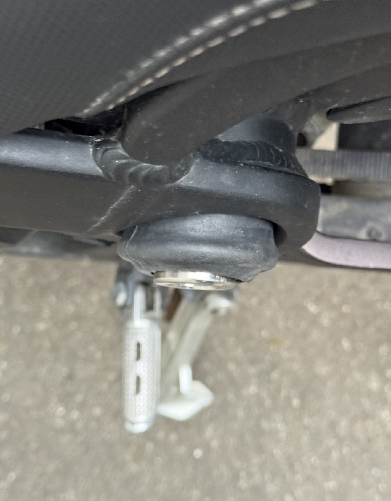 Habe mir das Querrohr im Rahmen, das du zur Adaption genutzt hast, mal angeschaut. Leider sind da fertigungsbedingt außen beidseitig leichte Rezesse, daher hängt deine Maschine auch leicht schief, wobei das Gummi natürlich dafür sorgt, dass nichts ins Rutschen kommt. Wenn man das vermeiden will, wird der Bau des Adapters leider erheblich aufwändiger, wobei ich eine Drehbank habe.
