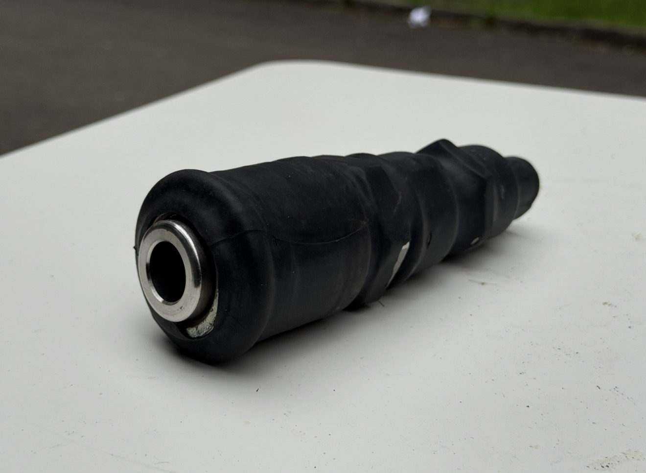 Da ich keine Drehbank zur Hand hatte, um das Teil direkt zu drehen, habe ich eine eigene Lösung aus Stahl gebaut. Ich habe verschiedene Rohre genommen, diese passend reduziert und das Ganze dann zum Schluss mit einem Gummischlauch umwickelt. Durch den Gummi sitzt alles absolut stramm, da wackelt oder löst sich nichts.