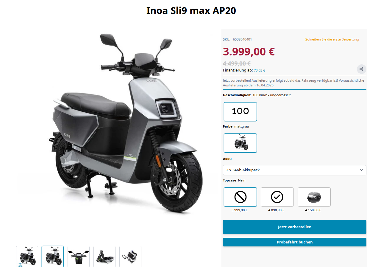 Die Preiskampagne war mir auch aufgefallen. Aber es heißt für den Sli max: "Jetzt vorbestellen! Auslieferung erfolgt sobald das Fahrzeug verfügbar ist! Voraussichtliche Auslieferung ab dem 16.04.2026"guewer hat geschrieben: Fr 13. Mär 2026, 06:02 der SLI 9 Max ist bereits ausverkauft, und scheinbar kommt auch keine neue Lieferung mehr nach.