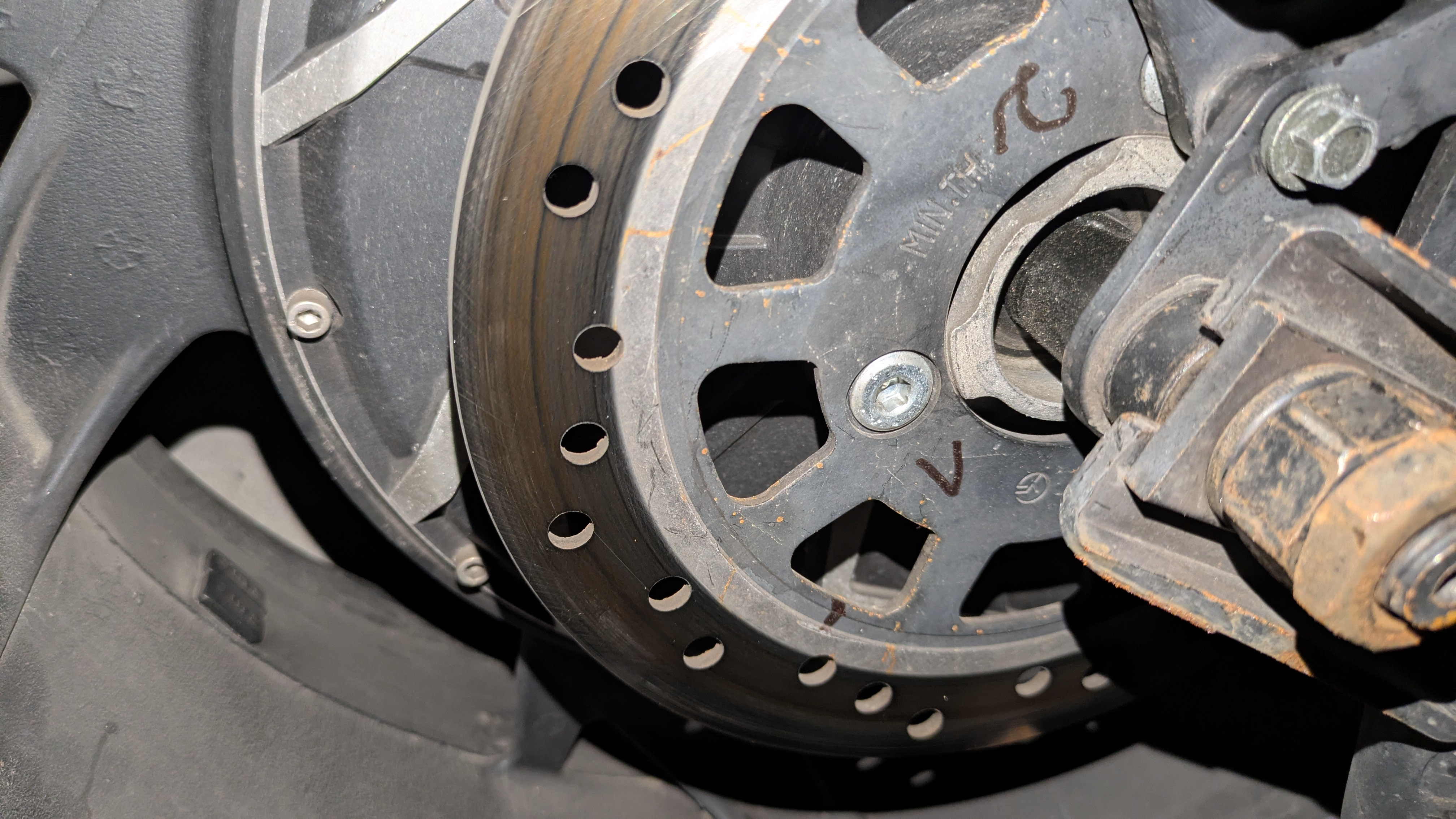 Bei meinem Neuzugang/Gebrauchtkauf ganz ähnlich. Dort ist die Scheibe im nicht verschlissenen Bereich allerdings gleich nur 3,6mm dick und dort wo abgerieben wurde zwischen 3,4 und 3,5mm. Auch dort steht: MIN. TH. - 3mm.