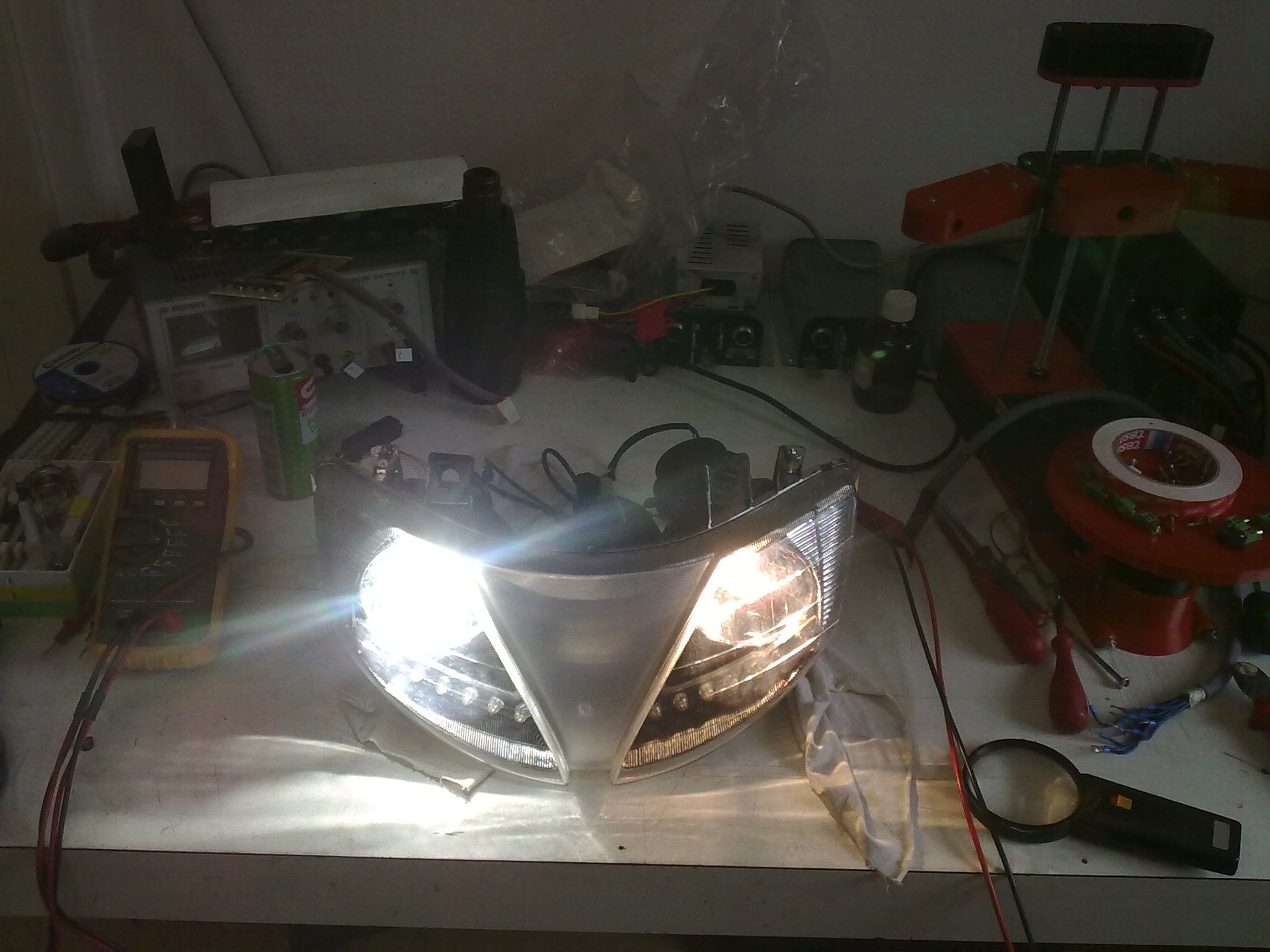 Ende Herbst fiel mir ein leichtes Spiel im Lenkkopflager auf, das ich vergangene Woche behoben habe und bei dieser Gelegenheit, da die Frontverkleidung ohnehin abgeschraubt war, die H4 Lampen durch LED Leuchten ersetzt habe .