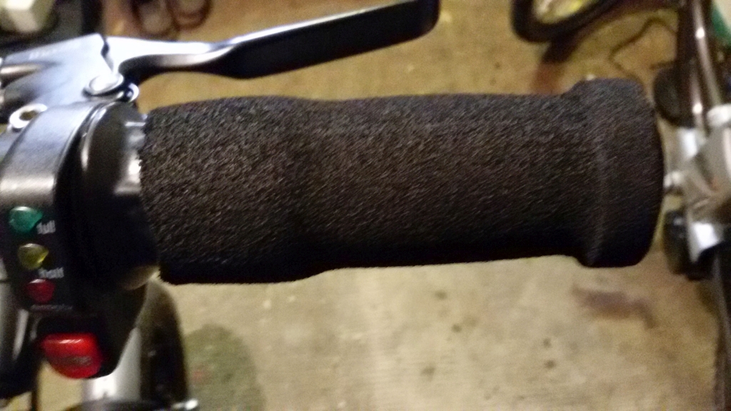 Beim rechten Griff habe ich erst einmal die großse Scheibe entfernt, dann den Moosgummiüberzug zurück geschoben und von dem inneren Plastirohr ein Stück in der Breite des Drehreglers abgeschnitten. Dann passt der Moosgummi über den Drehregler und der Rest vom Griff dreht sich leicht auf dem Lenker.