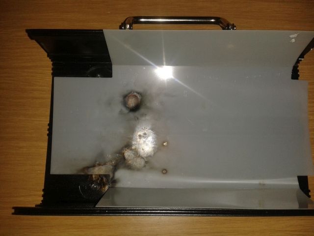 Aber das Gehäuseinnenteil und die Platine ist leider total verschmort: