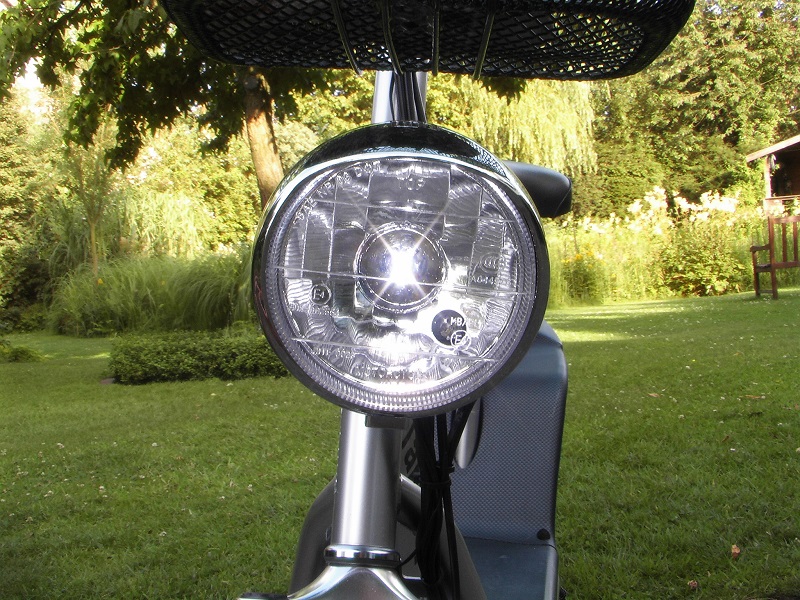 Der Scheinwerfer sieht schon toll aus, deshalb hatte ich die H4 Halogenbirne gegen eine 1W-LED mit Kühlkörper ausgetauscht. Das Prüfzeichen findest Du immer auf der Glasabdeckung.