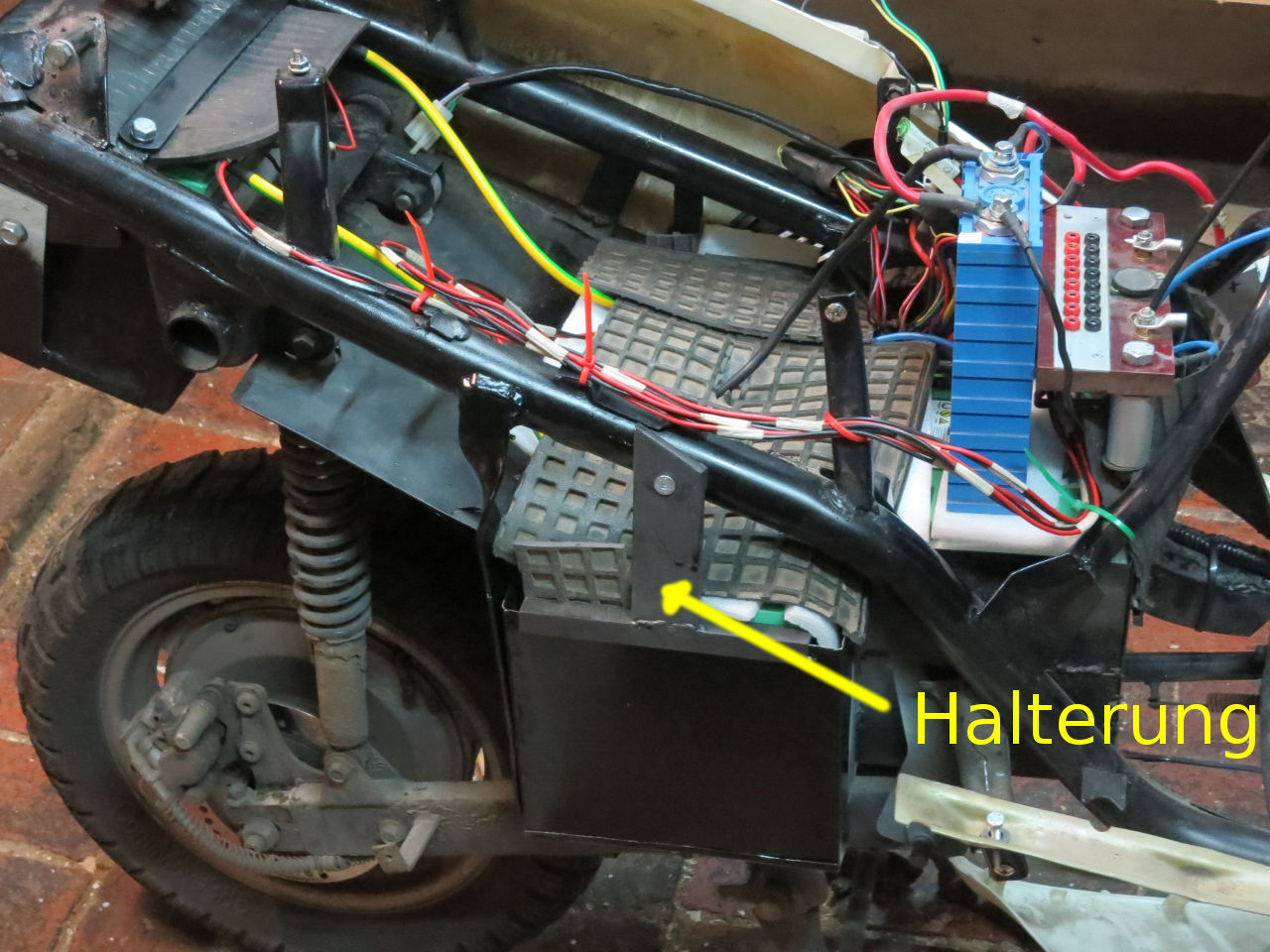 Und noch ein Nebeneffekt: Die Spannung, die ich früher zwischen Rahmen und Batterie messen konnte, ist weg. Ich habe im Kabelbaum die entsprechende Stelle gefunden: Die scharfe Kante des Batteriekastens war dauerhafter als die Isolierung. Jetzt ist die Kante weg und der Baum durch Leerrohr geschützt.