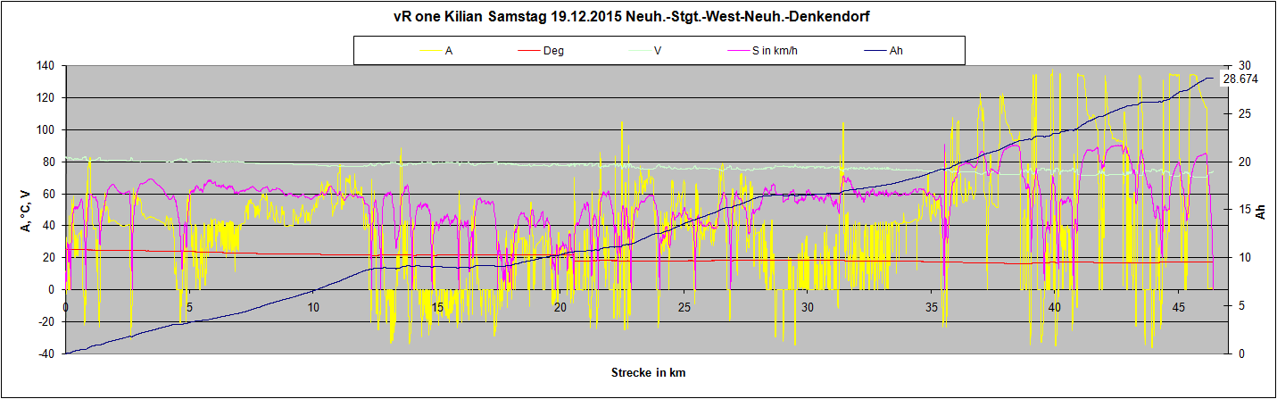 Das BMS macht mit seiner warnenden roten Ladesteckerblinkerei schon ab 75V Batteriespanung unnötig früh den Fahrer nervös. Das wäre ab 70V weitaus angebrachter! Größtes Manko von Batterie und BMS ist allerdings, dass wohl mindestens eine Zelle schon so schwächelt, dass schon nach knapp 29Ah (von angeblichen 43Ah Zellenkapa!) mein Reichweitentest schlagartig und unumkehrbar zu Ende war. 2,4km heimschieben waren die Konsequenz, obwohl sich die Batterie zwischenzeitlich wieder auf 73V berappelt hatte! Das BMS hat eine so hohe Hystereseschwelle bei den Einzelzellen einprogrammiert, dass es schlicht den Fahrstrom abgeschnitten hat. Zusätzliches Manko dieses BMS ist auch, dass keine externe Auswertung der Zellspannungen möglich ist, sprich der schwächelnde Pappenheimer kann nur bei einem Komplettausbau der "leeren" Batterie und Einzelmessung der Zellen ermittelt werden. Da ist wieder die HV Kilian gefragt... Die erzielte Reichweite selbst mit den unvollständigen 28,674Ah Entladung betrug jedoch beachtliche 46km, im bergigen (oder eher taligen) Großraum Stuttgart! Von einer Kuriosität gibt es noch zu berichten: nach einer Woche Standzeit um Weihnachten rum (mit dem Frontschild unter einer Moped-Plane), wollte ich zu einer Beschleunigungsmessung starten, aber das Abblendlicht blieb aus, und die Blinker waren alle 4 dauer-an. Rück- und Bremslicht funktionierten normal, und auch der Motor wurde vom Controller bespaßt - aber kein Abblendlicht vorn. Kein aus- und einschalten, Not-aus aus und wieder an brachten Besserung. Bis ich den Lenker hin- und herdrehte, und auf einmal war der Spuk vorüber - die Beleuchtung tat wieder, wie sie soll. Das gefällt mir überhaupt nicht, das scheint mir derselbe Müll an nicht wasserfesten Steckern und schlechter Kabelverlegung wie bei unseren Chinakrachern zu sein, obwohl eigentlich rollerweit Automotive-Standard Stecker verbaut sind?!