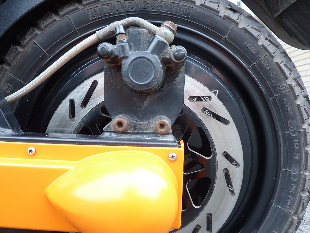 2011 waren die schwarz-orangenen mit Sevcon-Controller size 4 ( Das Helmfach wurde horizontal abgeschnitten und ein neues Unterteil angeschraubt, damit der Sevcon 'reinpaßt). Vorne wurde er mit einer 240mm Bremsscheibe ausgerüstet - Nachteil man muß zum Bremsbelagwechsel das Vorderrad ausbauen. Hinten blieb es bei der 190er Bremsscheibe.