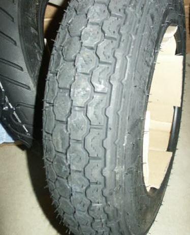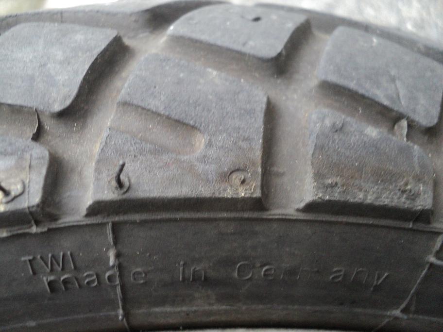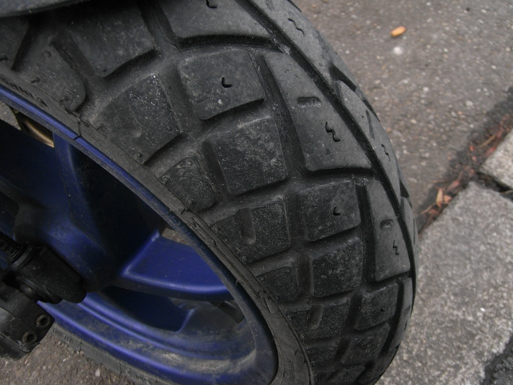 Erst mal der hintere mit gerade mal 200km Laufleistung: Im Detail sind die kleinen Diagonalrillen in der Mitte ganz gut zu erkennen, ebenso wie die deutliche Rille in Reifenmitte, die bei neuem Reifen vor allem vorn anfangs für leichte Unruhe bei Geradeausfahrt sorgt: Und jetzt der Vordere mit 4 Jahren und 24 000km auf dem Buckel, da ist von den Diagonalrillen natürlich nix mehr zu sehen, dafür der Laufrichtungspfeil auf der Flanke: