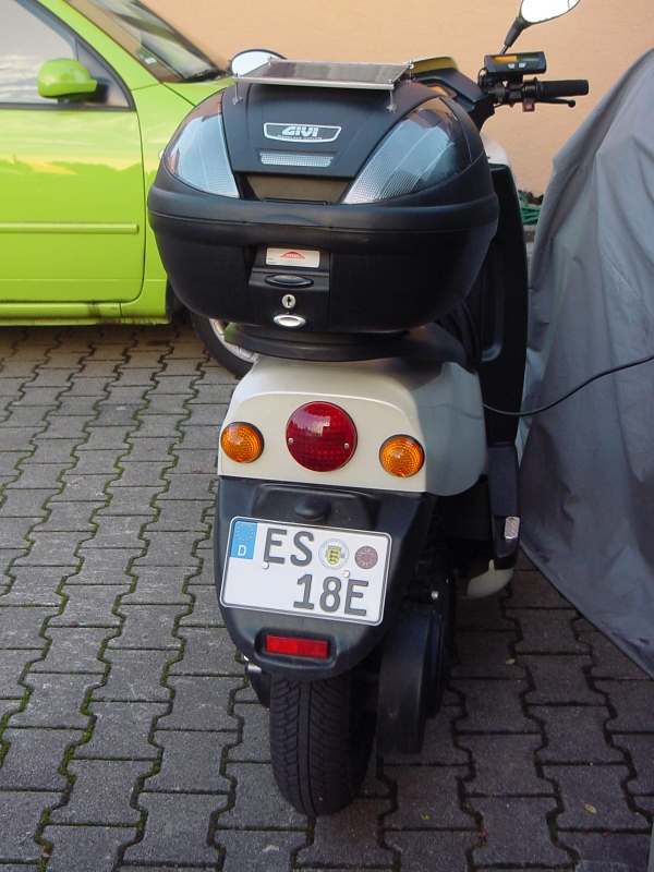 Glückwunsch zur Zulassung deines Leichtkraftrades. 2 Buchstaben + 2 Ziffern + E sowie Saisonkennzeichen paßt übrigens nicht aufs (Leichtkraftrad)-Kennzeichen - ich wäre sonst mit meinem E-Max 120s auch der Zweite in meinem Landkreis gewesen.