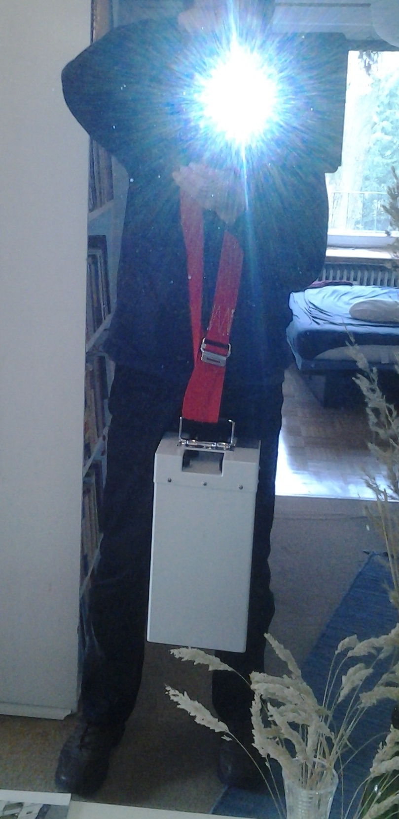 Mit meinem gebastelten Gurt kann ich das Teil ganz gut auf meinem "Ladeweg" tragen, soeben ausprobiert.