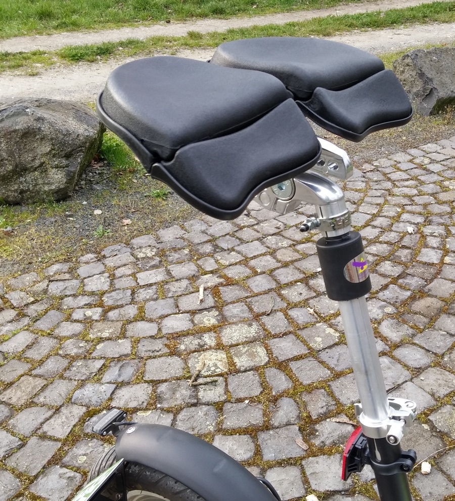 Nachdem ich viel über die Schädlichkeit von Fahrradsätteln für die männliche Gesundheit und Prostata gelesen habe, und auch der Puchsattel mit seinem Horn nach kurzer Fahrt in meinem Untergeschoss eine arge temporäre Taubheit verursachte, habe ich nun einen neuen Sattel. Mit gefederter Sattelstütze.