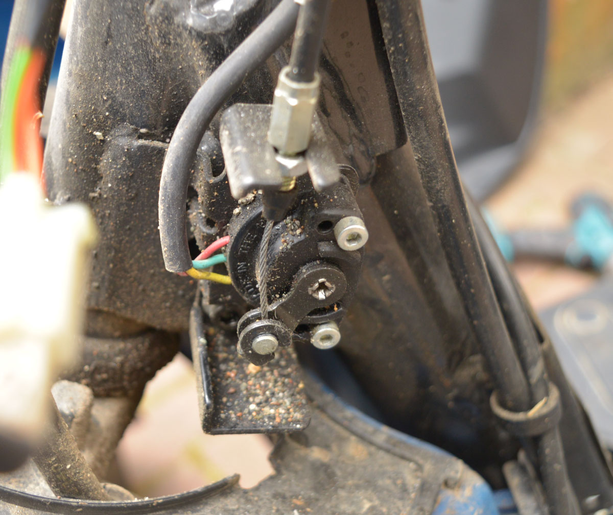 Gaspoti sitzt unten am Lenkrohr, wird über Zug betätigt, obwohl exponiert dem Dreck ausgesetzt, funktioniert das ja.