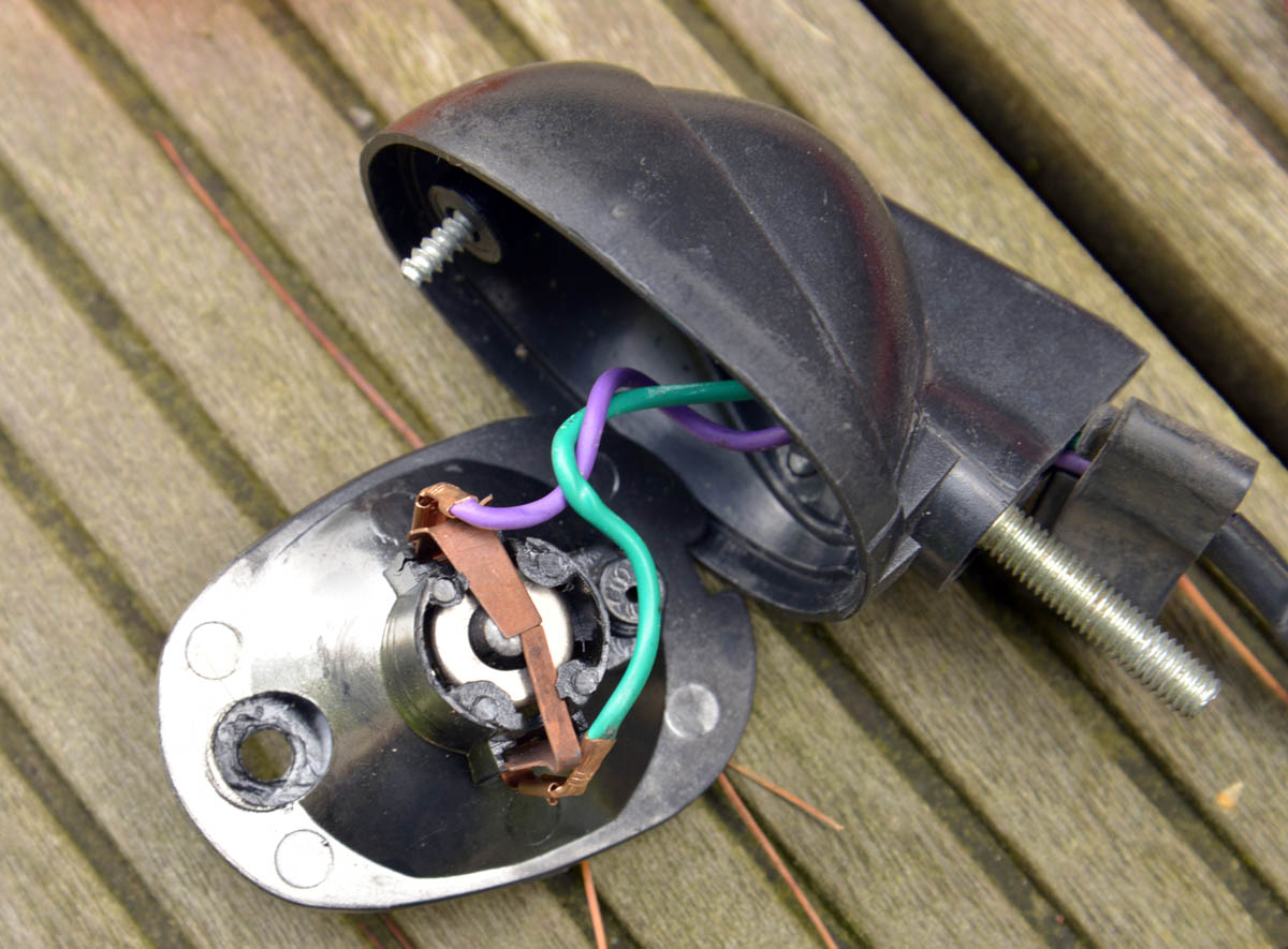 Nach dem Zerlegen des hinteren Blinkers war alles klar: Ein satter Kurzschluss. Das passiert,wenn man bei diesem Modell die Blinkerbirne wechselt. Hat man Pech, springt die 2.Kontakt Klammer heraus und wird beim Wiedereinbau gegen den anderen Kontakt gedrückt. Eine Zeitlang halten DCDC Wandler, Blinkrelais /Schalter und das Relais dies aus verhält sich wie ein defekter Blinkerschalter.