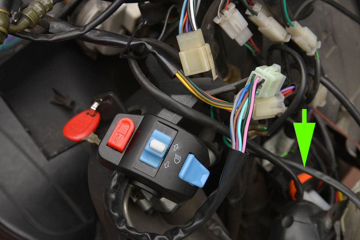 Anschlüsse (Hier ist die 48V Version mit zwei weißen Kabeln verbaut, die beim Leuchten der OD LED, die Batteriespannung > Controller unterbricht. ) Das ist eine Hilfsspannung vom Zündschloss.