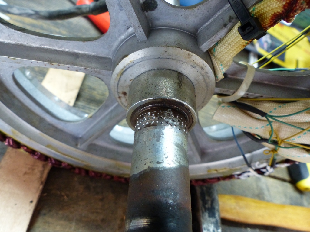 Noch ein Problem: zumindest auf der Scheibenbremseneseite hat der Lagersitz auf der Statorwelle etwas zu viel Spiel zum Innenring des Neuen Lagers, jedenfalls mehr als mir lieb ist. Da ist nichts saugendes mehr, was aus meiner Sicht aber eigentlich sein sollte, der Innenring "noddelt" leicht uznd gut sprübar auf dem Durchmesser rum. Gibt es irgendwelche Ideen, wie man dieses Spiel verringern könnte, ohne Auftragsschwießen und nochmalige Drehbearbeitung der Welle? Es lastet natürlich das hintere Fahrzeug- und Zuladungsgewicht drauf sowie die sicher immer noch extreme elektromagnetische Belastung...