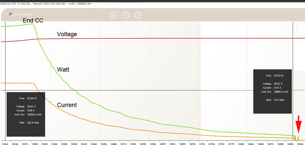 Auch wenn mein System ein 16s System mit anderen Spannungen/Strömen ist, sieht das bei Dir genauso aus. Wieder - Einschaltpeak (Nochmal dranstecken, bzw. an und abschalten) ist mit dem roten Pfeil gekennzeichnet.