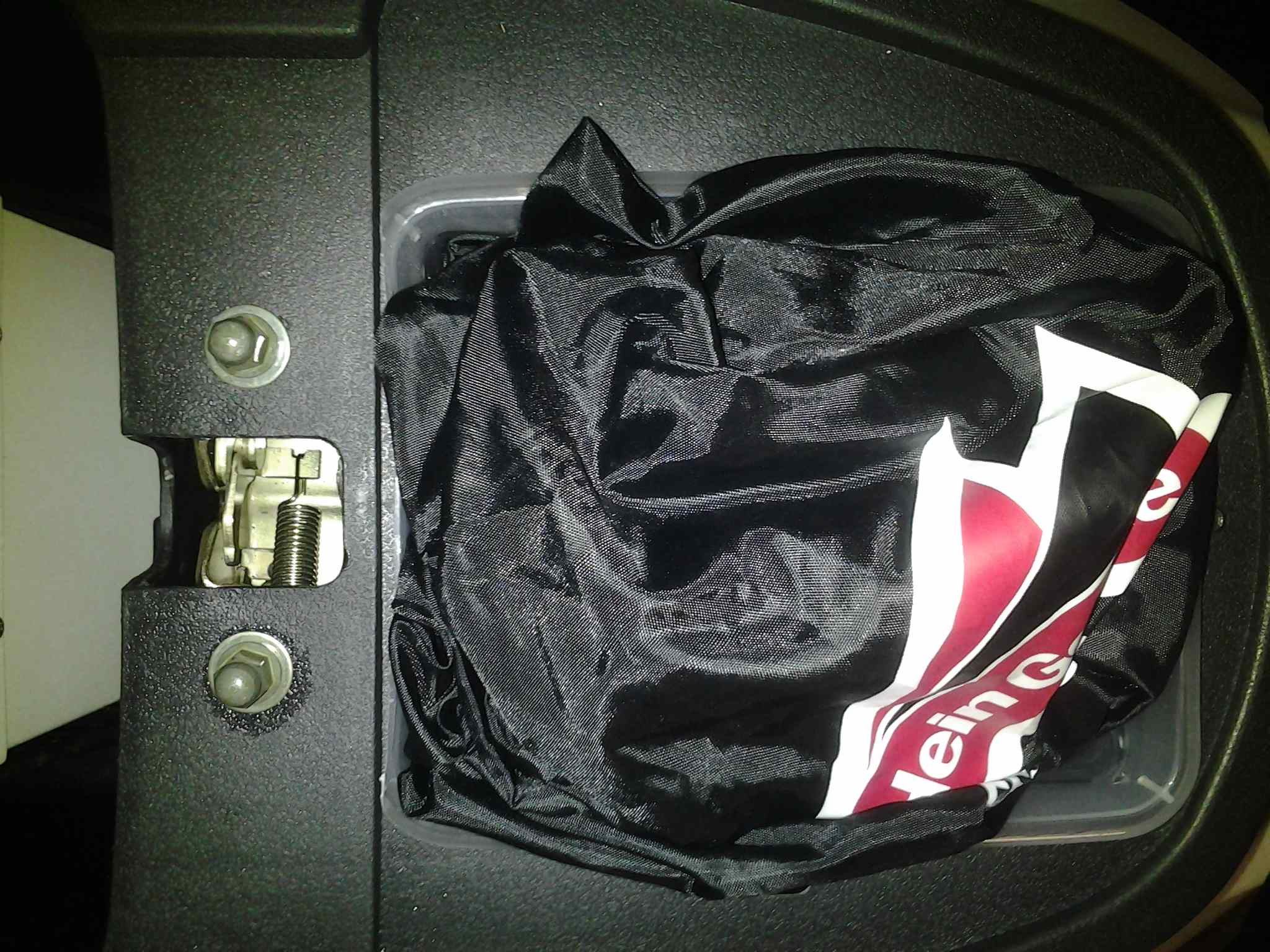 Der Sitzbankbezug gegen Regen passt gut rein und kann sich da voll ausdehnen ...