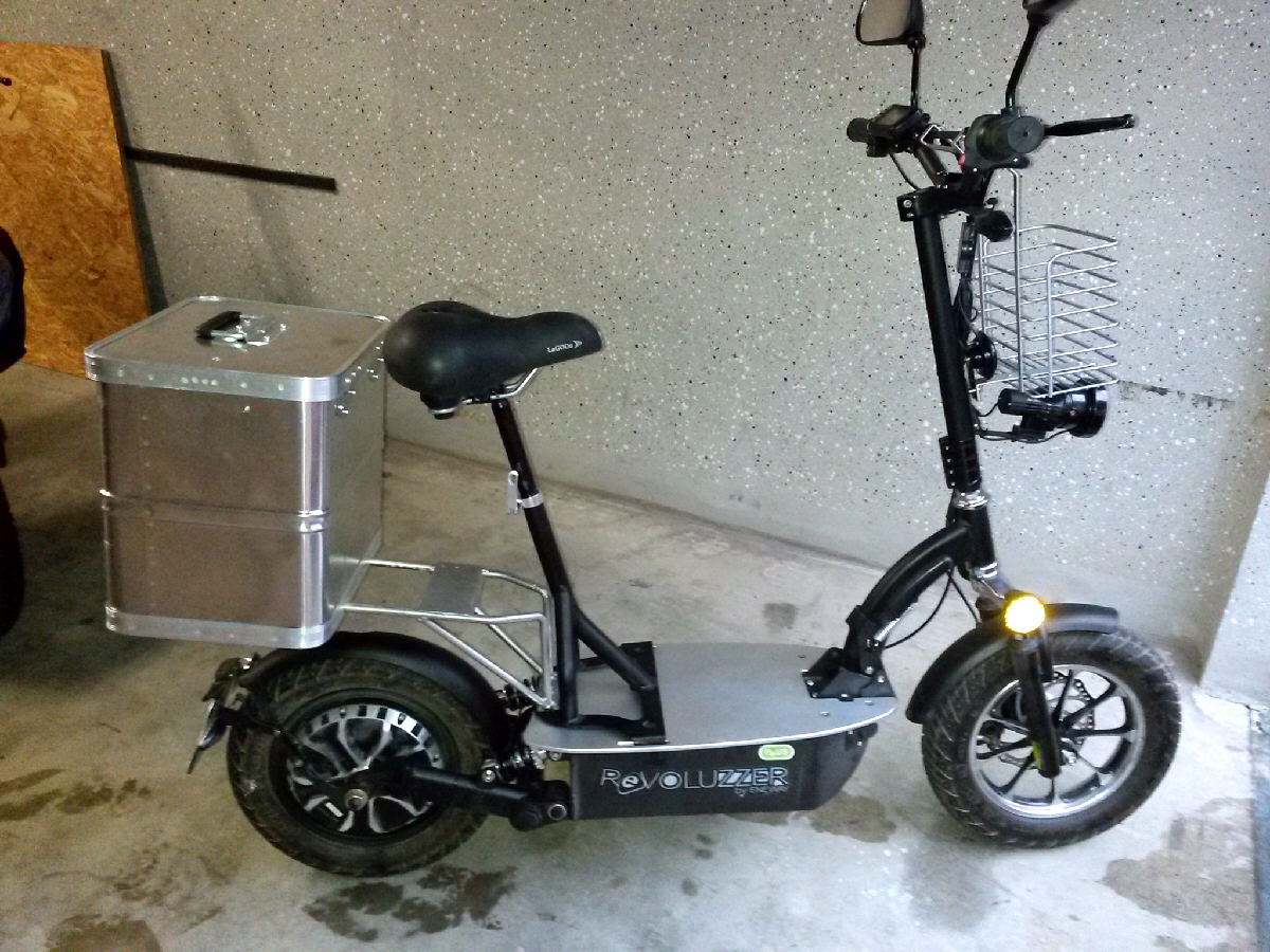 Der Scooter hat jetzt ein Körbchen vorne und einen Gepäckträger aus Edelstahl, sowie ein Alu Case bekommen. Genug Platz für die täglichen Einkäufe.