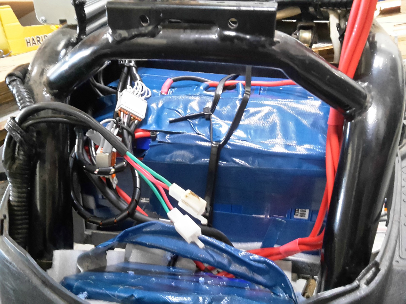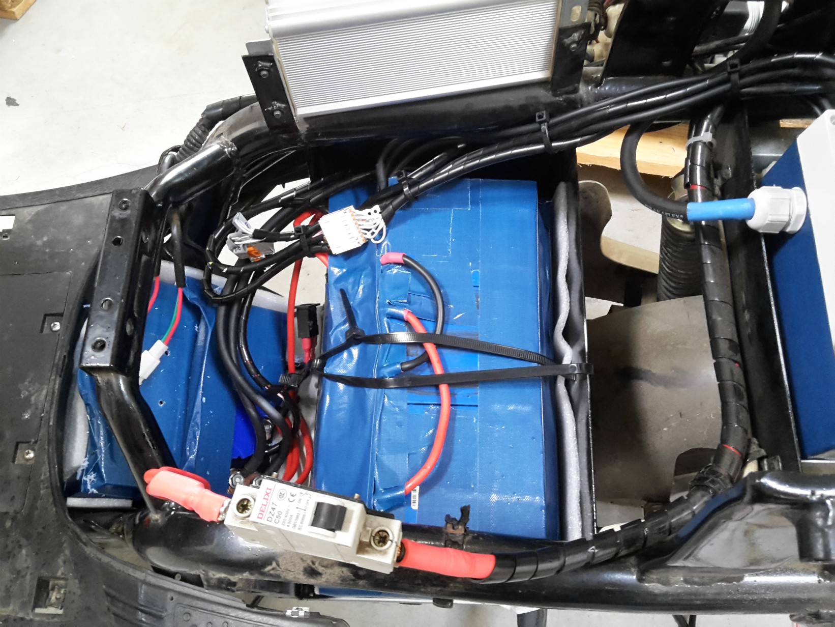 Ergänzendes: Bei der Demontage wurden auch die Werksseitigen, "hochwertigen" kabelverbindungen erneuert, die Batterieverkabelung wurde in 3 x 6mm² ausgeführt. Das "BMS Kästchen" fand auf dem hintersten Batterieplatz seine Position.