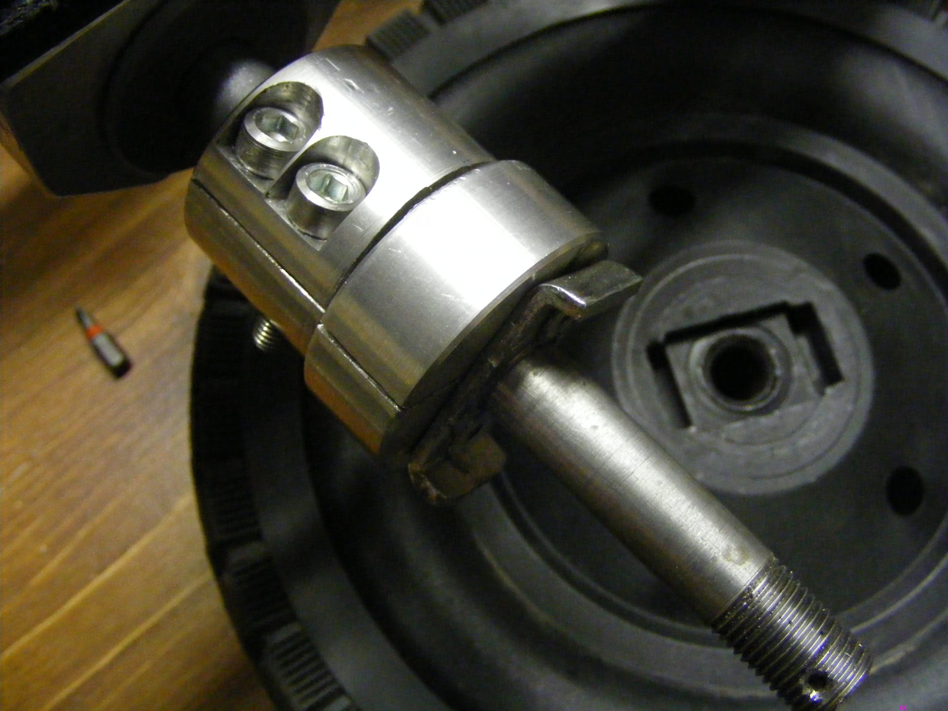 Nach den Schweißarbeiten gings dann mit Arbeiten an der Drehbank weiter. Der Mitnehmer für das Antriebsrad musste gefertigt werden. Mein Werkzeugmachmeister Fritz hat sich auch direkt wieder eine Lösung mit einer Klemmung auf der Achse einfallen lassen. durch die Klemmungen kann man wirklich alles individuell nachjustieren und ich bin froh, dass wir keine Bauteile auf die Achse geschweißt haben. Man muss immer mal wieder was abnehmen oder nachjustieren weil man es vorher gar nicht so genau messen kann. Die Klemmungen lassen einem einfach mehr Spielraum und man ärgert sich nicht, dass irgendwas klemmt, verkantet oder schräg/schief läuft. Allein die Linie der Kette zwischen Motor und Kettenrad kann super justiert werden. Man kann auch mal einzelne Bauteile bei Verschleiß wechseln. Und, und und ...