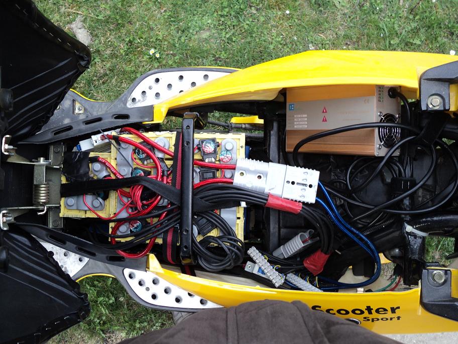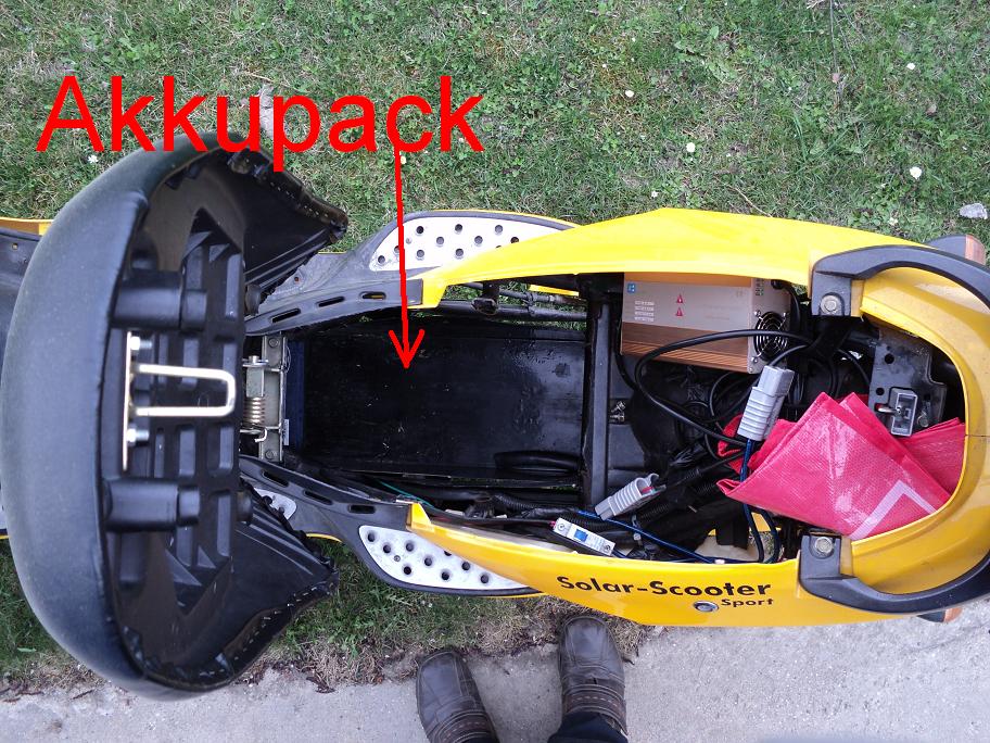 Mein Umbau betrifft den Solar Scooter Sport. Mein Roller hat einen sehr langen Radstand, vor dem Hinterrad ist serienmäßig eine Blechkiste, die sich bis in den Mitteltunnel nach vorne erstreckt. Vom Werk aus standen in dieser Kiste, alle in einer Ebene, die 20 Zellen. Grob gesagt, waren 10 unterm Sitz und die restlichen weiter vorn unterm Mitteltunnel.