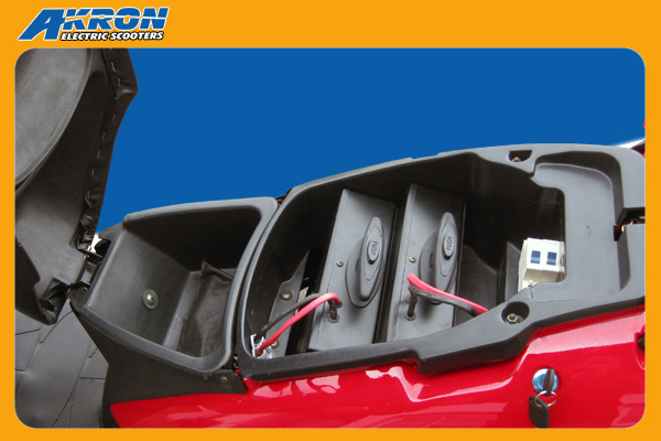 Diese 2 Packs sind sehr kompakt und stecken lustigerweise schräg drin, vermutlich um dem Rohrrahmen auszuweichen. Damit ist das Helmfach allerdings ausgefüllt. Oben aus den Packs schauen die Kabel raus, die man an und ab steckt, und -schöne Detaillösung - ausziehbare Griffe, zum Ziehen. An den Unterseiten der Packs sind für diesen Zweck kleine Rollen eingebaut.