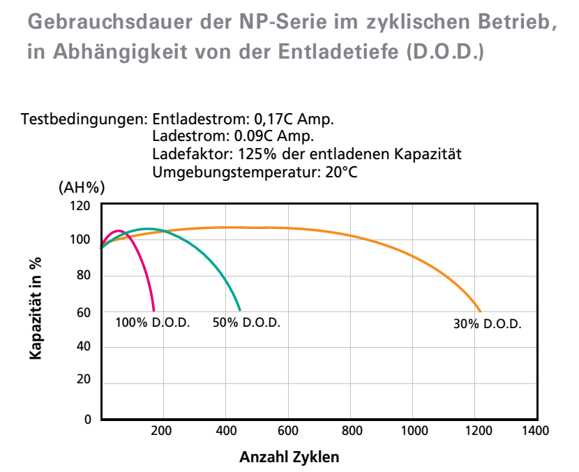 Wohlgemerkt auch nur beim leeren Akku!! Leer fahren sollte man einen BleiAkku sowieso nicht. Ab 50% Entladung fühlt der sich zunehmend unwohler. Wenn du den nur halb leer fährst, kannst du den Roller über Nacht wieder locker laden. Siehe Bild aus dem Datenblatt einer Hawker Batterie.