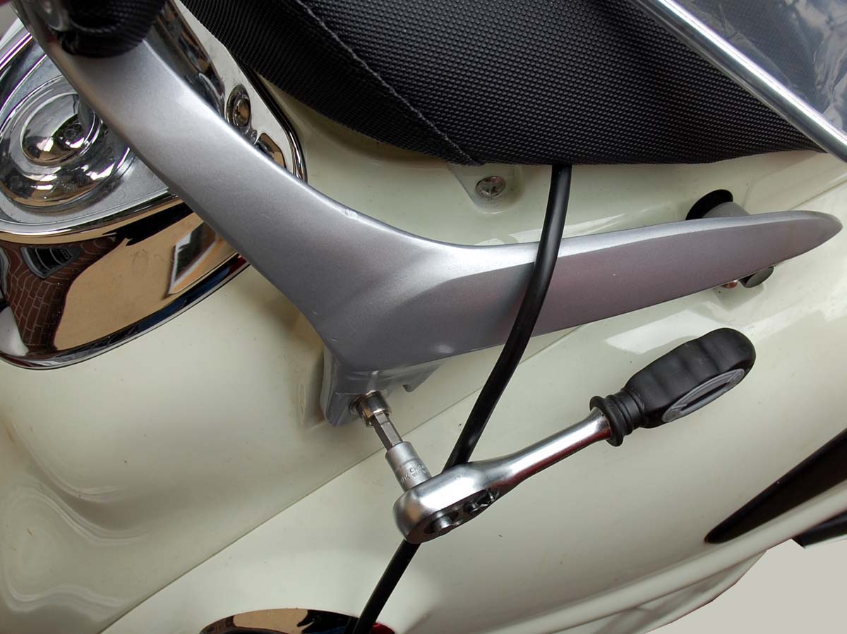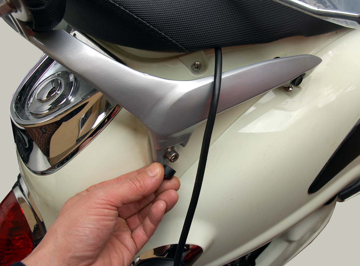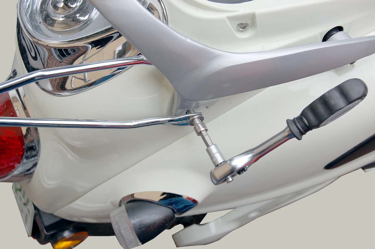 4. Anschrauben der Brücke an den Roller mit Inbus SW6 Hier werden zunächst die vorderen Schrauben (nicht festziehen!) ein paar Gänge hineingeschraubt und anschließend die hinteren . Gegebenfalls wird der Gepäckträger etwas nachgerichtet und mit den M8 Innensechskant Schrauben beigezogen. Diese waren beim vorliegenden ausreichend Roller lang . (ca 15mm Restgewinde).