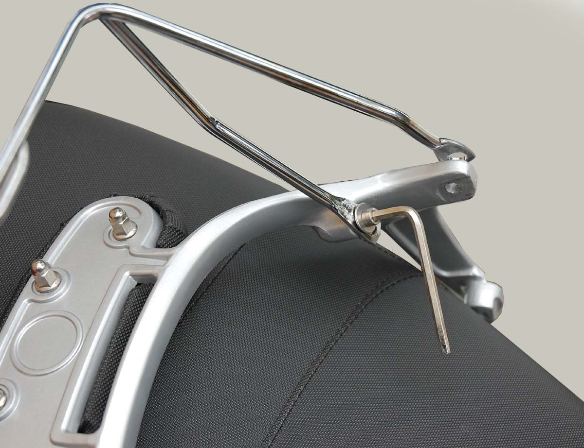 3. Anschrauben der inneren (horizontal gedrehten) Befestigungsbügel des Gepäckträgers an die Brücke mit Inbus SW5 . Gegebenfalls müssen die äusseren