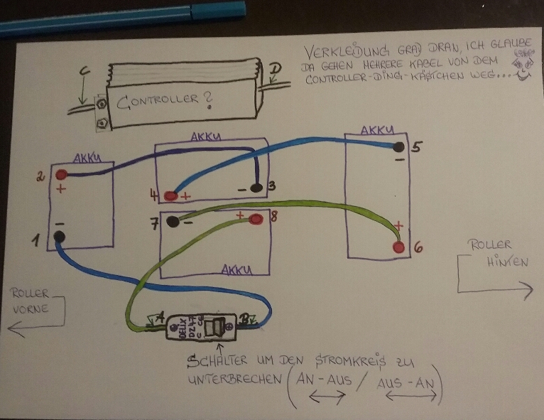 Da ich in der vorherigen Zeichnung den CA nicht berücksichtigt hatte, ( ich war schwer damit beschäftigt herauszufinden wie und wo die Akkus angeschlossen werden, ohne dass es einen Kurzschluss gibt und so dass der Roller noch einwandfrei funktioniert.....) , hier jetzt due aktuelle Zeichnung: oben der controller und unten im bild der on- off- schalter.....    <br />Weiter unten dann Fotos zur Zeichnung.....