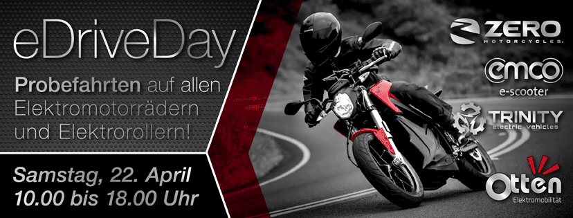 wir starten mit viel Energie in die neue Saison. Am 22.04.17 möchten wir euch unsere Produkte gerne im Rahmen unseres "eDriveDay" unter dem Motto "Blitz & Donner. Nur ohne Donner." vorstellen. Es werden mindestens sechs verschiedene Zero's vor Ort sein, darüber hinaus diverse Elektroroller von EMCO und TRINITY, unter anderem auch Neptun, Jupiter und Delivery. Alle Fahrzeuge stehen für Probefahrten zur Verfügung. Für Snacks und Getränke ist gesorgt. Darüber hinaus werden auch unser Tesla und unser Smart ED für die Besucher bereit stehen.