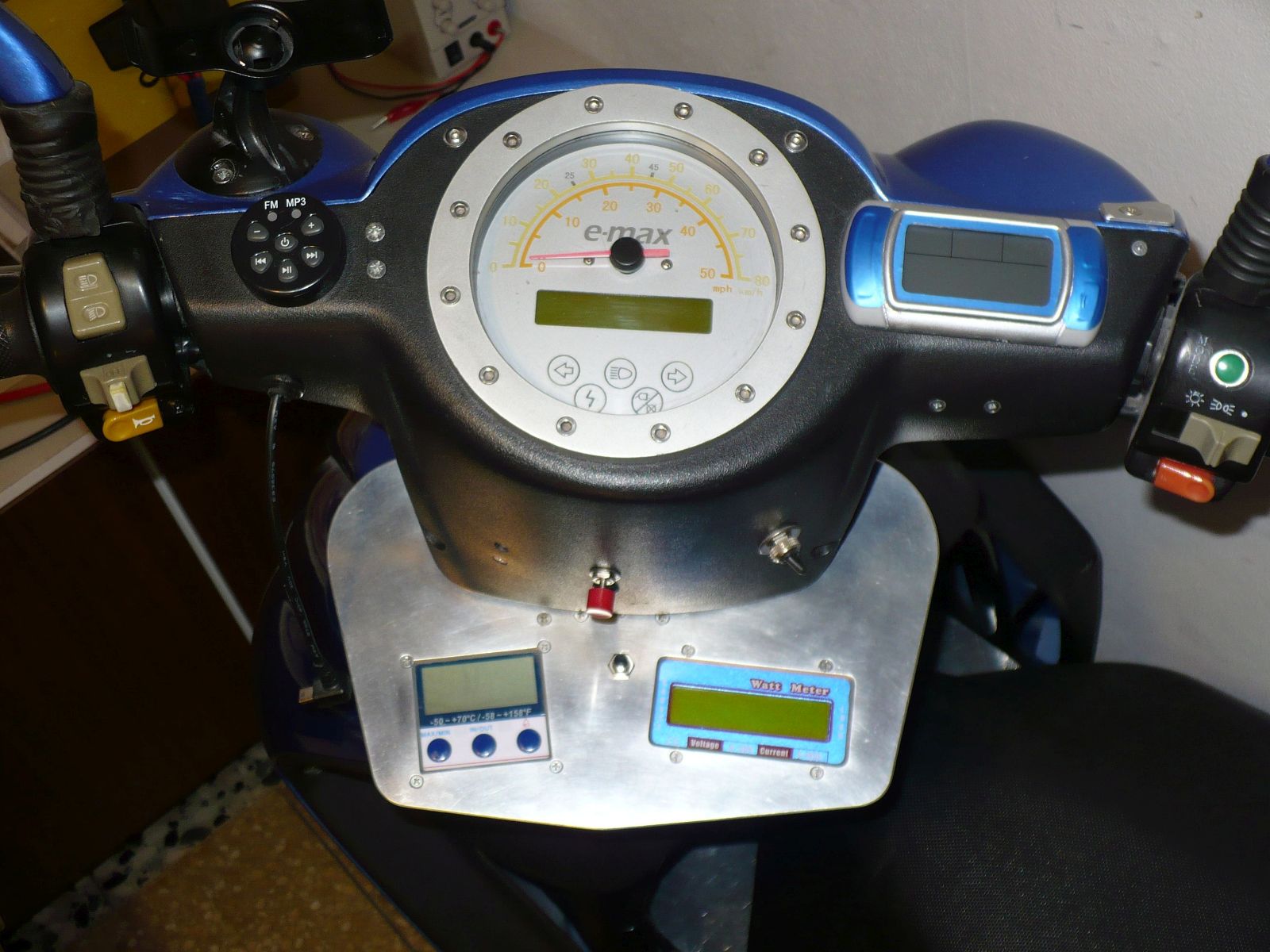 Vorhin habe ich mir überlegt, ob ich das Turnigy nicht etwas auseinandernehme ;) und auf der Unterseite vom Alupanel am Lenker (s.u.), wo das Watt Meter war, anbringe. Dann ist es schon mal spritzwassergeschützt und vielleicht auch einfacher, den Shunt abzulöten. Wenn's denn 10mm²-Kabel sein sollen, ist es sicher sinnvoller, den Shunt irgendwo im Batteriekasten unterzubringen. Von wegen Gewicht ;) und Länge der fetten Kabel...
