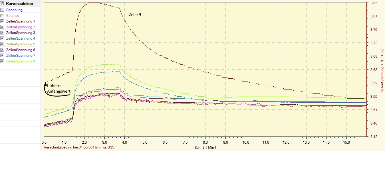 Alle anderen bleiben dann natürlich unter der erwarteten Ladeschlußspannung. Auch noch unerklärlich für mich: Spannung der Zelle 9 steigt unproportional zu den anderen. Wenn man mal den Anfangs-Spannungswert der Kurve zu Zelle 9 mal gedanklich nach unten schiebt, ist diese nicht deckungsgleich mit der Ladekurve der restlichen Zellen. Aber das ist wohl ein "elektrotechnisches Gesetz".