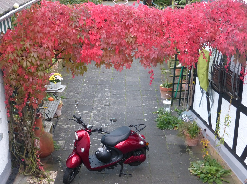 Ein roter Unu unter rotem Herbstlaub. Sehr schön.