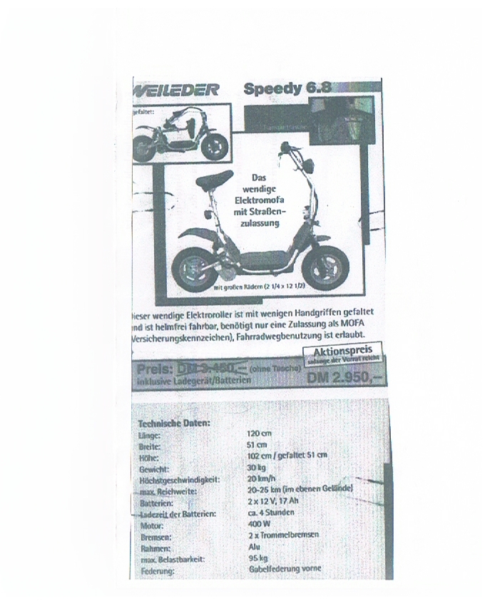 Moin, ich noch einmal. Der E-Roller kam aus Nord-Italien, von A.D.E.L, Typ 6.8. Innotech kam aus Kaernten, Korrnig, angeblich Geschaeftsfuehrer von Innotech, die wiederum will Importeur gewesen sein. Entsprechende Papiere hat Er mir zwar zugesagt, aber immer Ausreden!!! Korrnig ist ein aalglatter Schluchtenscheisser, der immer viel erzaehlt hat. Ich war mit ihm in Hamburg auf der Messe mit den Rollern. MfG