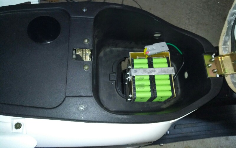 ..und eingebaut in einen ausgeschlachteten (Controller und Akku fehlte), nagelneuen Roller der mir günstig zulief, Helmfach musste bisschen Leiden, dafür kann man den Akku (ca.12kg) rausnehmen. Bauzeit Akku ca. 7 Stunden, Materialkosten ca. 700€