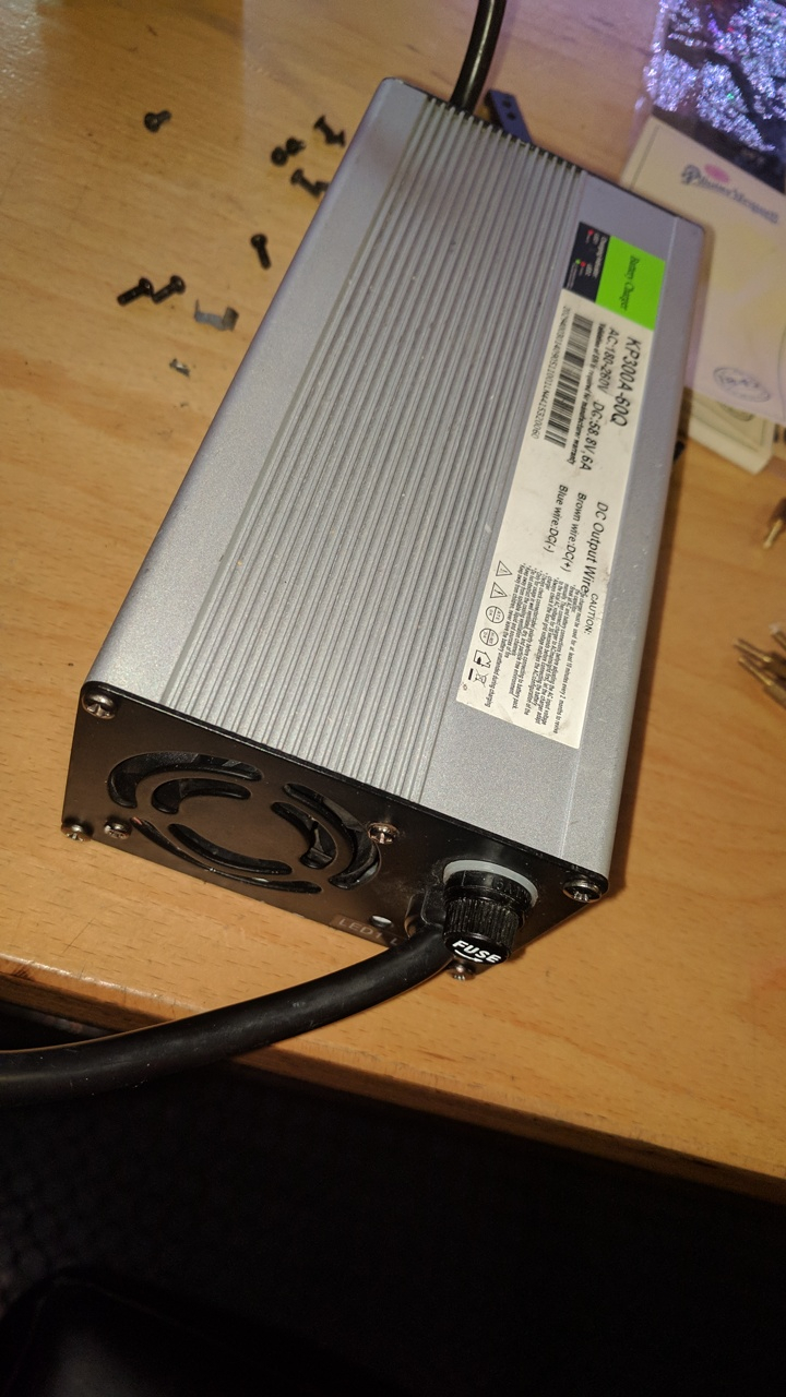Das ist ein geeignetes 300W King Pan Ladegerät, eingestellt für 4 Bleigel (14.7V/Batterie). Standardzubehör bei China Bleirollern. Ersatz dafür gibt es z.B. bei Li Trade oder Ebay.