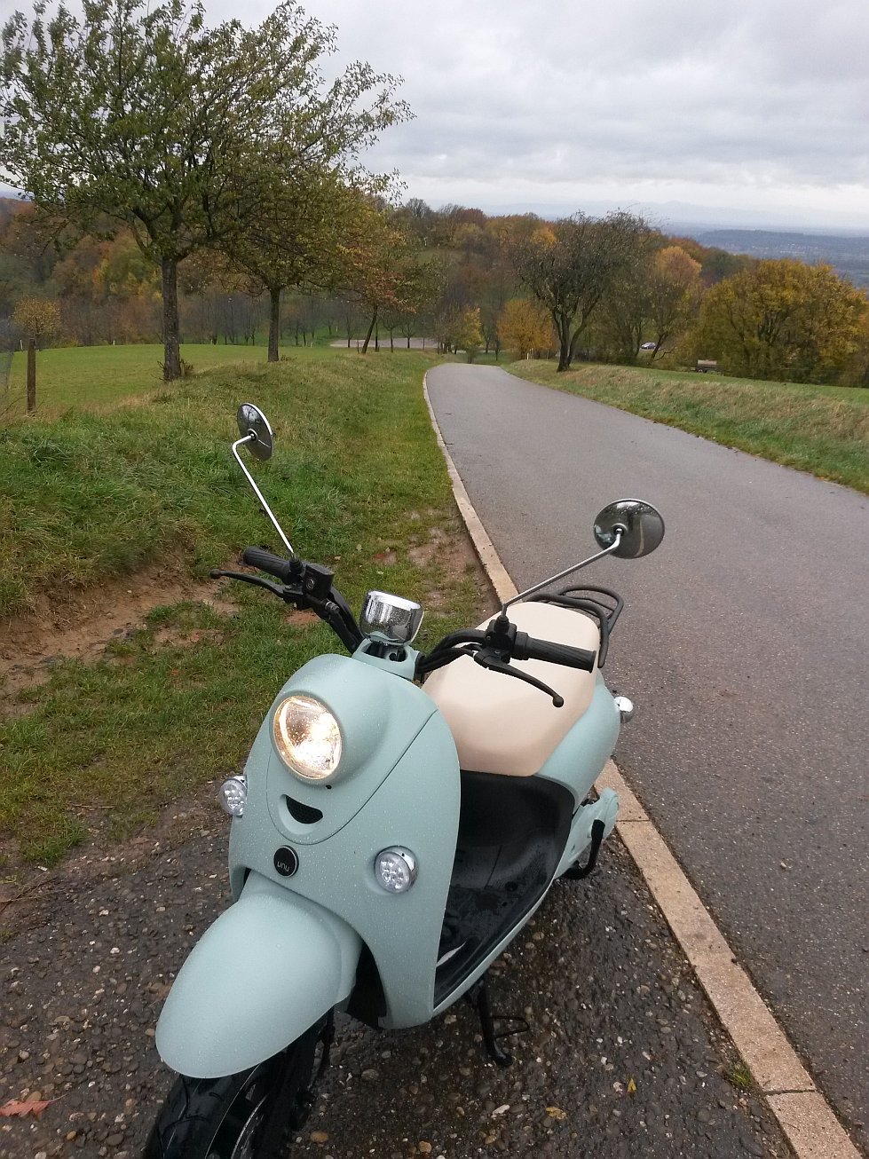 Seitenständer war ein bisschen gefährlich an der Stelle; als ich die Handschuhe eingesammelt habe, habe ich gemerkt, dass der Roller leicht am wegrutschen ist...