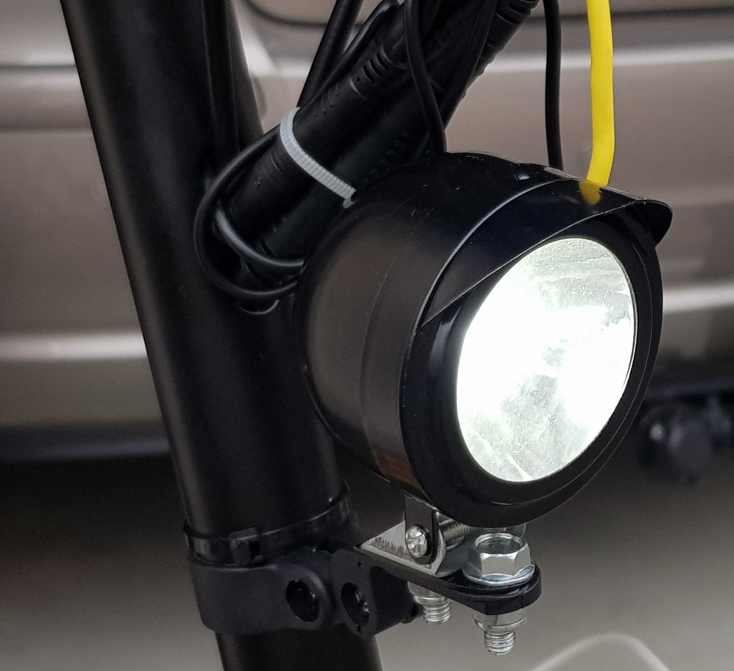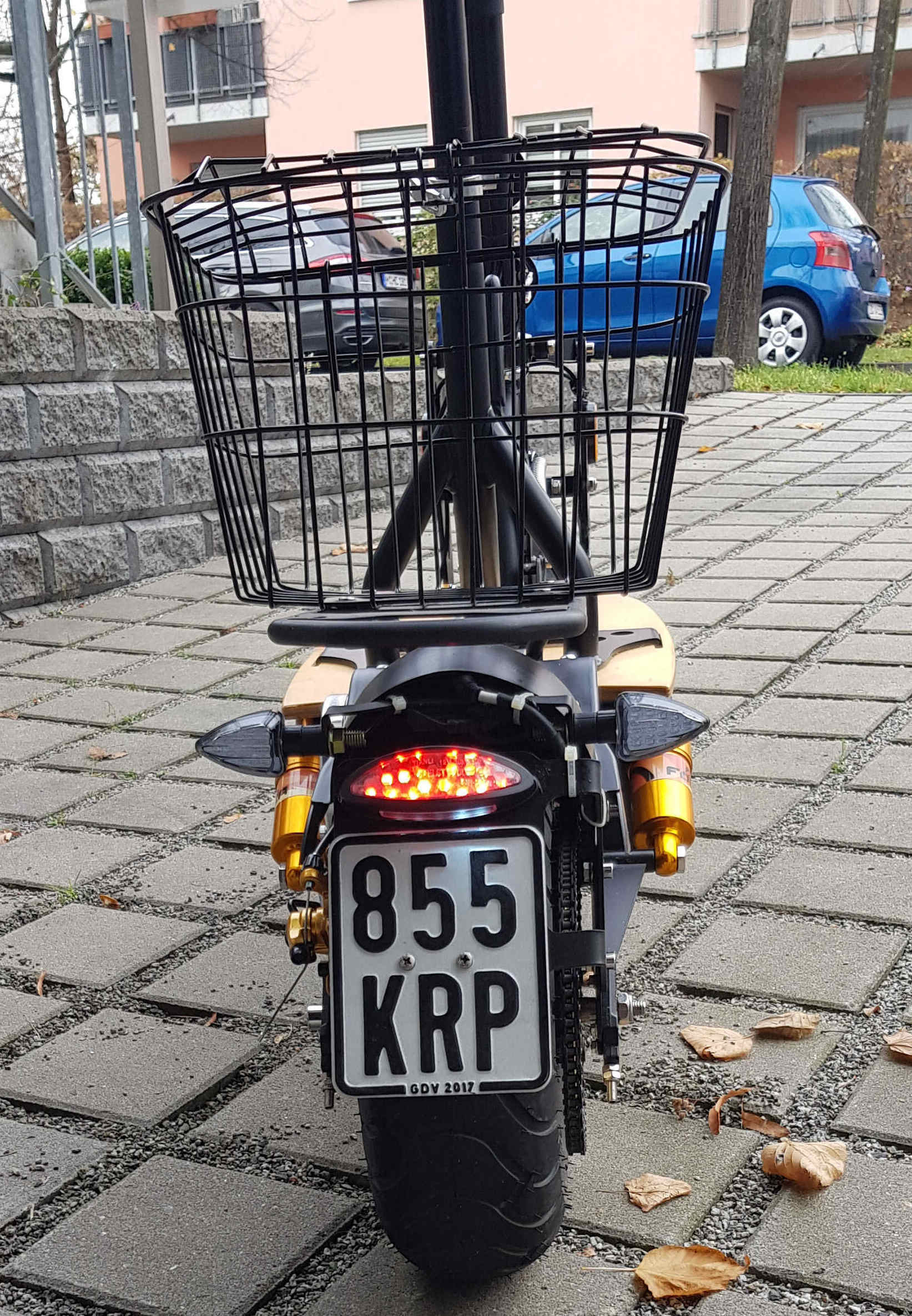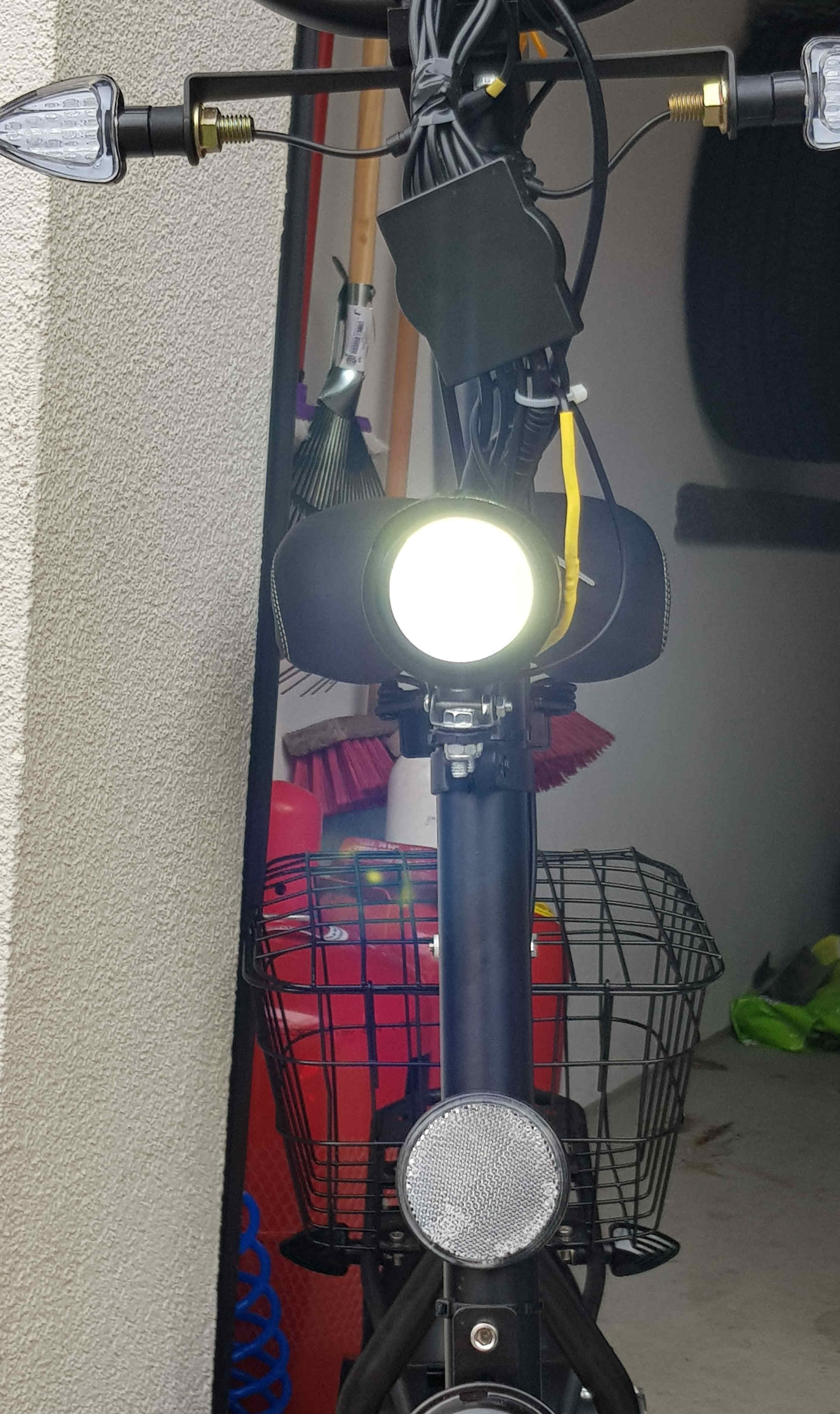 Durch einen gutgemeinten Hinweis begutachtete ich das Originalrücklicht am Roller. Dabei stellte sich raus. das dieses genau hinter der Nummernschildhalterung verschwand. Auf Grund seiner Größe ist es eh nicht gut sichtbar. Hinter dem Nummernschild allerdings fast gar nicht. Da bei diesem Roller der "Feind" von hinten lauert, musste ein neues Rücklicht dran, welches nicht zu übersehen ist. Problem: fast alle auf dem Markt befindlichen Rücklichter sind nicht verwendbar! Beim Forca 3.7 wird das Rücklicht mit einem Dauerplus (rot) sowie den jeweiligen geschalteten Minus (Rücklicht schwarz und Bremse weiß) angesteuert. Erste Möglichkeit, Rücklicht umbauen. Ich habe mich für die zweite Möglichkeit, die Einfachere, entschieden. Brems- und Rücklichtdraht verbunden, das Rücklicht über einen kleinen Wiederstand und das Bremslicht direkt angeschlossen. Geht ausgezeichnet. Alles passt in einen kleinen Schrumpfschlauch und kann wasserdicht verschlossen werden. Bei dieser Gelegenheit habe ich auch den 55W H3 Frontscheinwerfer(in der Beschreibung steht H1) durch einen neuen Scheinwerfer mit nur 5W LED ersetzt. Das direkte Ersetzen der Glühlampe durch eine LED brachte nur unzureichende Ergebnisse. Die Steckverbindungen habe ich jeweils beibehalten. Weniger Leistung und wesentlich mehr Licht auf der Straße! Laut StVO ist man ja gezwungen, auch tagsüber mit Licht zu fahren. Einzige Bedingung für beide Umbauten: gültiges Prüfzeichen auf den Leuchten. Dann gibt es auch keine Probleme mit der Trachtentruppe!