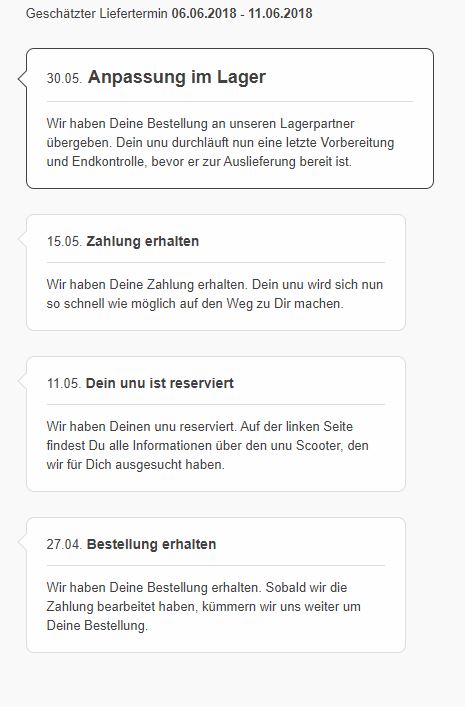 Ich habe meinen Unu am 12.5. bestellt und darauf eine Bestellbestätigung erhalten, das Lieferdatum wurde auf das Zeitfenster 26.5.bis 1.7. festgelegt.