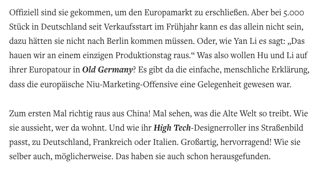 Eigentlich sagt das (ohne den Artikel ganz lesen zu können) wenig aus. Bezieht sich das nur auf die 2017er Modelle (N1S/M1/M1Pro) oder ist das die Gesamtsumme der NIUs (also auch die, die schon 2016 hier gelandet sind)? Selbst dann wären diese Zahlen beachtlich - vielleicht auch, weil andere Elektroroller-Firmen die Öffentlichkeit mit Absatzzahlen in Deutschland scheuen. Warum wohl? Bei Emco wäre es mir ja noch egal - die haben ihr Sortiment zusammengestrichen und konzentrieren sich auf 3 L1e-Roller. mit dem S5000 scheint der Letzte schnellere Roller aus dem Sortiment zu fallen (jetzt wo Andere in diesen Bereich vordringen). Aber Emco hat noch andere Geschäftsfelder, da scheint die Rollerproduktion inzwischen zu einen Nischenprodukt zusammengeschrumpft zu sein - obwohl sie ein Servicenetz in Deutschland aufgebaut haben.