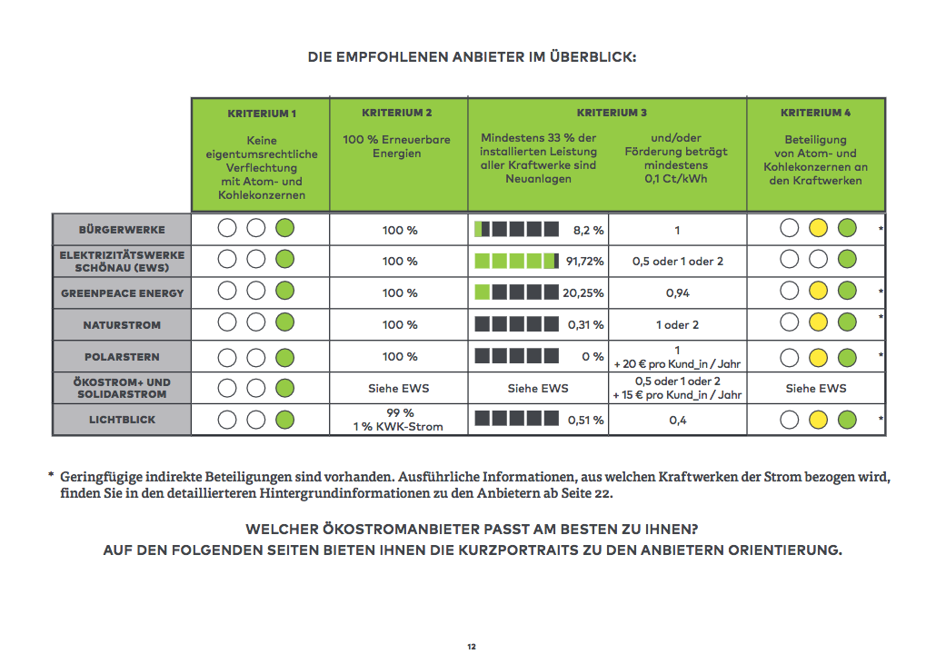 Vielen Dank! Super Darstellung. "Greenpeace Energy" hatte ich auch schon auf dem Schirm und ist mit 27,1ct pro KWh gar nicht so viel teurer. Die anderen schau ich mir jetzt mal genauer an.