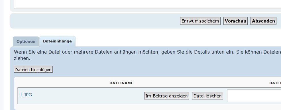 und klickst nach dem Hochladen, wenn rechts der grüne Pfeil das ok anzeigt, auf "im Beitrag anzeigen"
