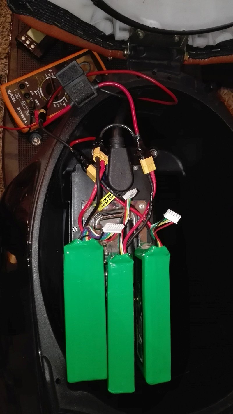 Als Nächstes habe ich mir TESTWEISE aus meiner umfangreichen Lipo-Sammlung einen 6S und zwei 4S je 5AH per Kupplungen zusammengebrutzelt und mit dem Controller verbunden (die 25A KFZ Sicherung scheint das sogar mitzumachen). Beide Speicher zeigten zu Beginn exakt 57,5V. Kein Knall, kein Rauch, es funzt, wie es soll! Mal schauen, ob ich mir auch was "Dickeres" zusätzlich als Akkuschoner und Reichweitenverlängerer dranhänge...