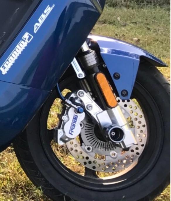Sehr konsequent finde ich es zudem, dass man dem auf die Sprünge geholfenen E-Hobel auch eine dem gestiegenen Speed angepasste Bremsanlage spendiert. Ob es gleich mit ABS sein muss, da scheiden sich sicherlich die Geister und ein deutscher TÜV-Prüfingenieur würde den ABS-einbauenden E-Rolleristen vielleicht sogar gern einsperren wollen, aber es hilft in der Not und ich würde soetwas auch für Roller der 45er Schleichgarde ab Werk begrüssen.