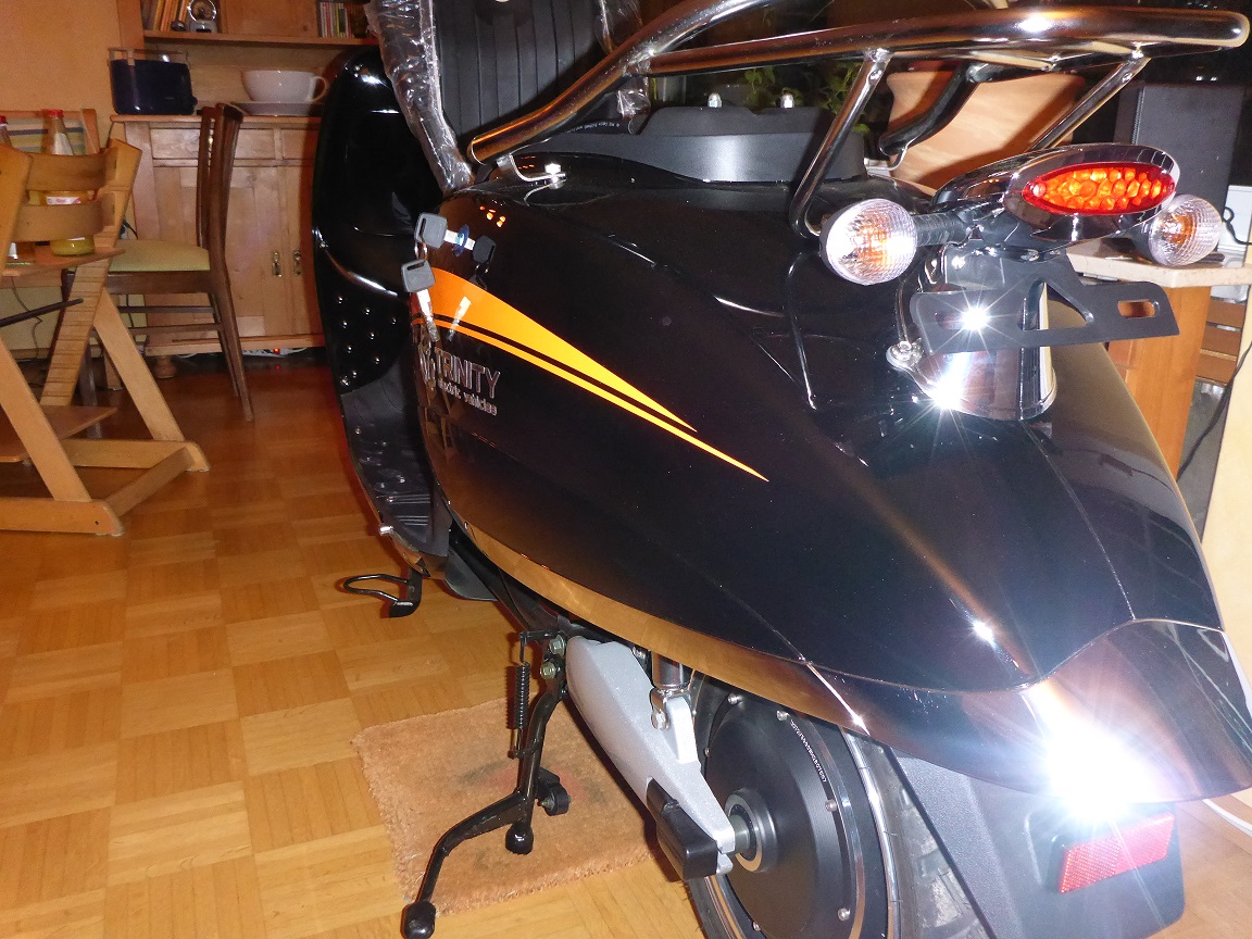 - Webseitenbilder nicht mehr ganz aktuell. Ich hatte mich auf das dargestellte Modell mit verchromtem Lenker und hinten integrierten Blinkern eingeschossen. Tatsächlich kam jetzt das neue Modell mit schwarz lackiertem Lenker und am Rücklicht angesetzten Blinkern.