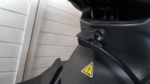 Ich lade meinen Roller immer im Carport. Ich stecke also einfach das Ladergerät vorn in die Ladebuchse und gut.